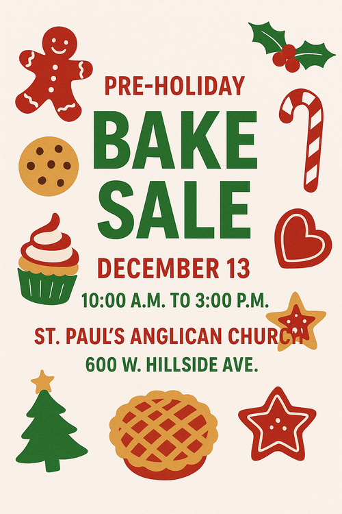 Does Santa come to your house and find the same cookies year after year? Put a twinkle in Santa's eyes! St. Paul's Anglican Church at 600 W. Hillside Ave. is having a pre-Holiday BAKE SALE on December 13 from 10-3. There will be cakes, cookies, pies, homemade candies and other yummy treats! Let us make your treats for you this year!