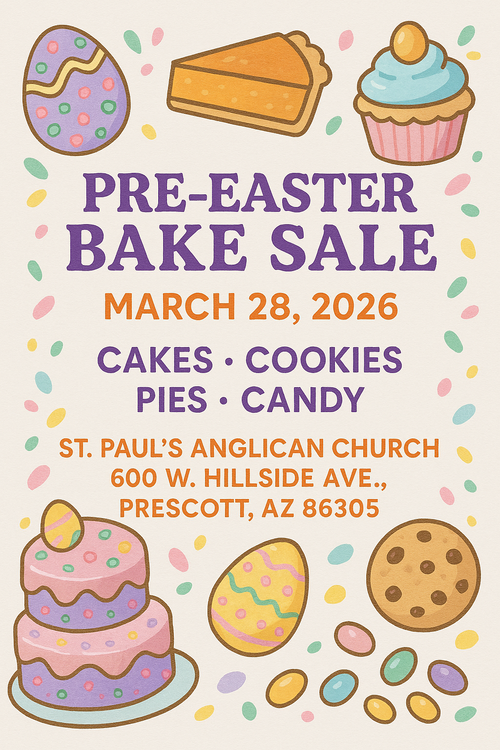 There will be a BAKE SALE on October 4 from 10:00 a.m. until 3:00 p.m. at St. Paul's Anglican Church, 600 W. Hillside in Prescott. There will be luscious baked goods and homemade candy including truffles and pralines! Cash or checks only please. There will also be a Blessing of the Pets. It is customary to bless the pets on the Feast of St. Francis (the Patron Saint of Animals) which is October 4.